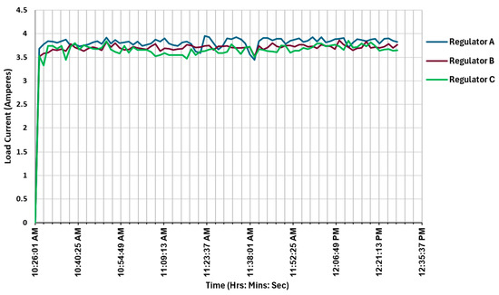 As shown in Figure 8, all three charge regulators consistently supply current to the lighting load at levels approaching the full-load current of 3.76 A. Minor fluctuations in the supplied current are attributed to variations in solar irradiance. Regulator A delivers a slightly higher current to the load, attributed to its superior conversion efficiency. Figure 7 illustrates the solar PV voltage for each charge regulator circuit. Since solar module voltage is directly proportional to solar irradiance, an increase in irradiance is observed as the day progresses from 10:26 a.m. to 12:27 p.m. [43]. Fluctuations in irradiance due to intermittent cloud cover are also noted. Despite these variations, Figure 7 shows that the solar PV voltage remains relatively stable, which is characteristic of PWM charge regulators. Unlike the MPPT type, the PWM regulators regulate the PV module voltage to remain close to the battery voltage [44].
