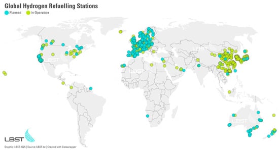 Map of hydrogen refueling stations around the world. Source: [52].