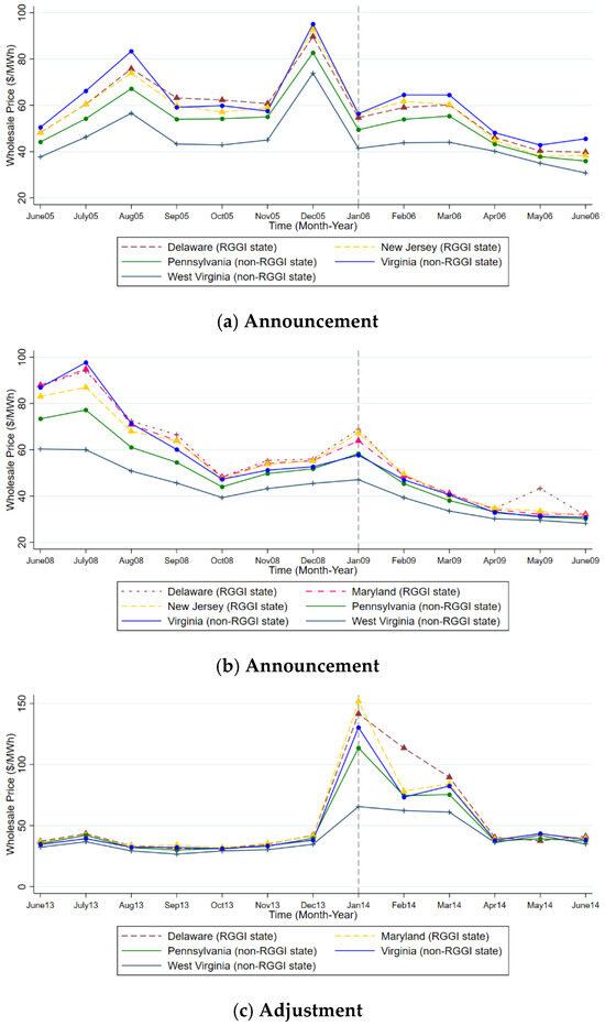 We focus on three alternative periods to model the three events studied. The first is the RGGI announcement on 20 December 2005. To isolate the impact of the announcement of RGGI on electricity prices, we focus on a single electricity wholesale market, PJM, as it allows us to construct treatment and control groups. Within the PJM, New Jersey and Delaware announced the RGGI participation in 2005, followed by Maryland in 2007. We excluded Maryland from the treatment group while studying the RGGI announcement, as Maryland announced only in 2007. Pennsylvania, Virginia, and West Virginia are chosen as controls because they are neighboring non-RGGI states, sharing similar energy market structures and demographic conditions with New Jersey and Delaware. Power plants in these five states constitute our baseline sample.