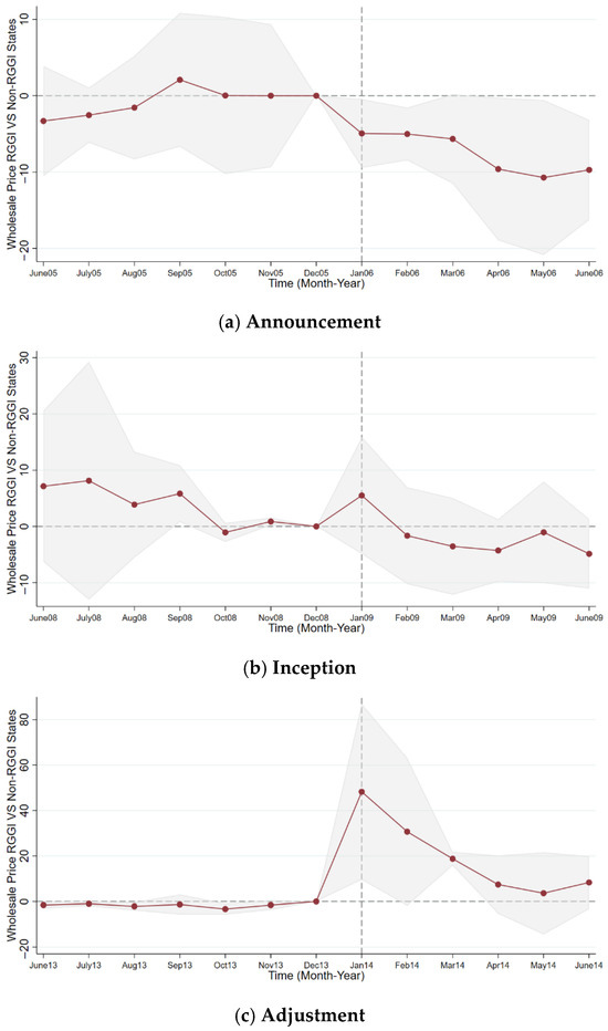 Finally, we present the results related to lowering the emission cap in 2014. Based on the model selection criteria, the findings in Table 3 indicate that reducing the emission cap led to an increase in wholesale electricity prices, ranging from 6.8 to 55.66 $/MWh (0.68 to 5.57 cents/kWh). Figure 3c shows the results of the parallel trend in response to the RGGI adjustment (Equation (3)). There was a stable pre-trend, and the wholesale prices in the RGGI states were significantly higher than in non-RGGI states after the event.