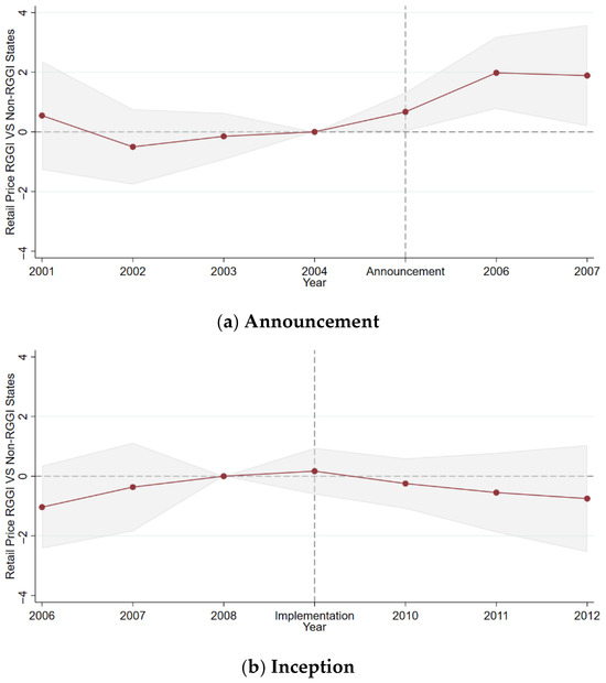 Figure 4a shows that from 2001 to 2004, retail prices in both RGGI and non-RGGI states followed similar trends. However, after the announcement of RGGI in 2005, the price gap between the two groups widened. Table 5 shows that after the announcement, retail prices in the RGGI states increased by approximately 1.1 to 2.1 cents/kWh more than in non-RGGI states. The price change is statistically significant. Relative to the average retail price before the event of 10.17 cents/kWh in both groups during 2001–2004, this represents an increase of 11% to 21%. However, these differences declined afterward, and the difference between RGGI and non-RGGI states decreased over time.