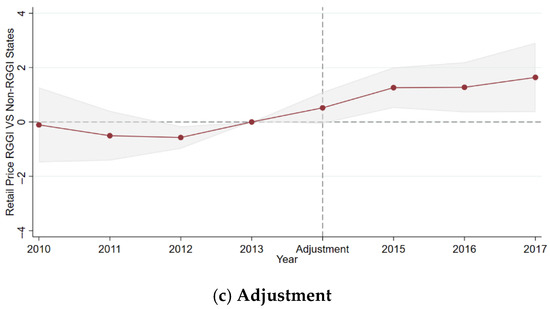 Finally, Figure 4c shows the impact of the RGGI cap adjustment. From 2010 to 2013, retail prices in both RGGI and non-RGGI states followed similar trends. However, since 2014, retail prices in RGGI states have increased relative to those in non-RGGI states by approximately 0.3 to 0.8 cents/kWh. This suggests that when the emission cap is binding, RGGI states may face higher pollution costs, leading to higher retail prices. Relative to the sample average retail price of 11.1 cents/kWh during the pre-event period (2009–2013), this represents an increase of 3% to 7%.