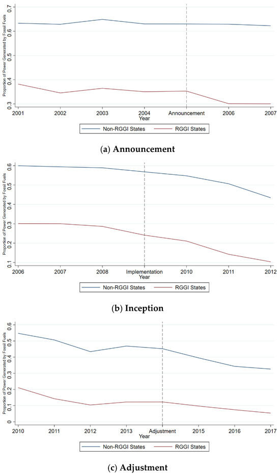 We begin by analyzing the use of coal and petroleum in electricity generation. Figure 5a shows the average share of electricity generated from fossil fuels in RGGI and non-RGGI states from 2001 to 2007. Before 2005, the trends in both groups were parallel. However, since the announcement of RGGI in 2005, the share of fossil fuel-generated electricity in RGGI states has decreased significantly, indicating the impact of the RGGI announcement in reducing reliance on fossil fuels.