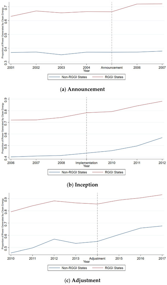 We now compare the share of electricity generated from clean energy in RGGI and non-RGGI states in response to three RGGI events. Figure 6 shows that since the 2005 announcement of RGGI, the proportion of clean energy in RGGI states has increased significantly compared to non-RGGI states. However, the implementation of RGGI in 2009 did not notably affect the energy composition in these states.