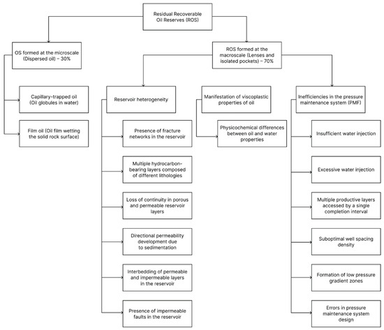 The analysis results are presented in the form of a conceptual diagram (Figure 1) illustrating the structure, hierarchy, and main factors governing the formation of residual recoverable oil reserves (RRO) in terrigenous reservoirs. The diagram demonstrates the relationship between microscopic (≈30%) and macroscopic (≈70%) forms of residual oil, as well as the physical and technological processes controlling their distribution.