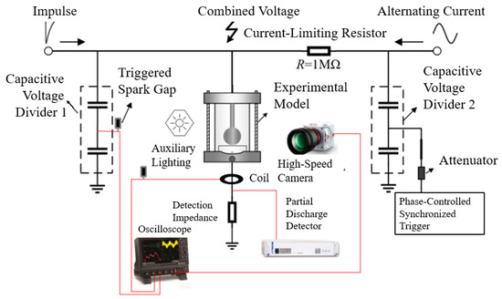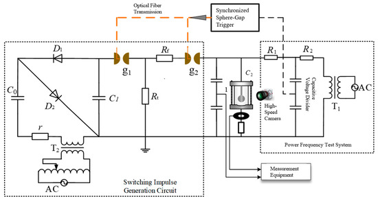 For the specific condition of AC combined with switching impulse voltage, the experimental setup established is illustrated in Figure 1. The setup comprises an AC test system, a switching impulse voltage circuit with a rated voltage of 100 kV, a sphere-gap synchronous triggering system, a partial discharge measurement circuit, and protective devices. The phase-shift triggering system acquires the voltage signal across the test object via a capacitive divider (C2). Utilizing a control module and optical fibers, it synchronously triggers the main sphere gap (g1) and the isolation/protection sphere gap (g2). Nanosecond-level synchronous timing control technology ensures the simultaneous operation of the two sphere gaps, thereby guaranteeing phase consistency and reliability of the voltage waveform superimposed at the defective end.