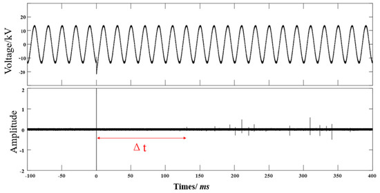 Under AC voltage alone, the PDIV for the wire-shaped particle was 9.5 kV. Following the experimental procedure, a 19 kV switching impulse was superimposed onto a 9 kV AC background voltage (below the PDIV). The resulting time-domain PD waveform is shown in Figure 5. The experimental results indicate that no PD signals were detected when only the AC voltage below the inception level was applied. However, after the application of the switching impulse, sustained PD activity appeared in the subsequent AC cycles. A noticeable delay (Δt) of approximately 7 AC cycles was observed between the application of the switching impulse and the emergence of significant PD signals.
