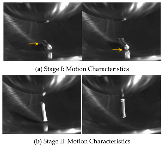 In the first stage, initially excited by the transient switching impulse, the particle exhibited a slight lift-off at its end with the larger radius of curvature within approximately 1 ms. Subsequently, the entire particle entered a “seesaw-like” motion, as shown in Figure 6a. The positions indicated by the arrows in the figure represent the lifted and fallen ends of the metal particles. In this mode, one end of the particle rises while the other end falls, forming a reciprocating alternating lifting motion. The middle part remains relatively fixed, and when one end rises, the lifting angle changes between 0 and 90 degrees. In this mode, one end of the particle lifts while the opposite end descends, creating a reciprocating, alternating lifting motion with the central part remaining relatively fixed, resembling the action of a seesaw.