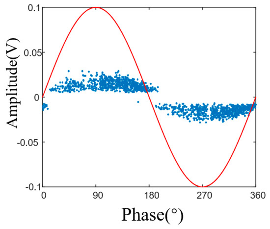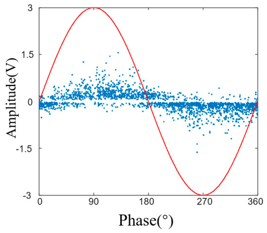 However, regarding the subsequent discharge behavior, the discharge intensity of the spherical particle was significantly weaker. As shown in Figure 10, the Phase-Resolved Partial Discharge (PRPD) pattern acquired under the AC voltage shows that while the discharges are distributed across the entire phase cycle, no discrete, large-magnitude discharge pulses are present. This is attributed to the limited electric field distortion caused by the spherical particle during its motion, which prevents significant energy accumulation. Furthermore, the bouncing amplitude is insufficient for the particle to reach (or closely approach) the high-voltage electrode, thus failing to generate the intense discharge activity observed with the wire-shaped particle.