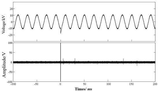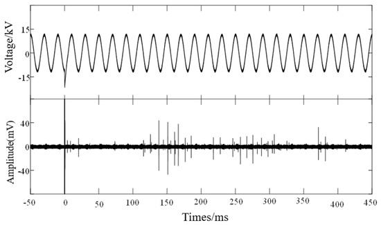 The PDIV for the spherical metallic particle under AC voltage was 7.6 kV, which is lower than that of the wire-shaped particle. The time-domain waveform obtained after applying a 7.2 kV AC voltage superimposed with a 15.2 kV switching impulse voltage (i.e., 2 times PDIV) is shown in Figure 8. In contrast to the wire-shaped particle, the spherical particle generated significant partial discharge signals within the first AC cycle following the superimposed impulse, exhibiting no observable time delay phenomenon as seen in Figure 5.