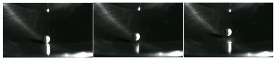 Furthermore, as shown in Figure 9, synchronous observation of its motion behavior revealed that the spherical particle rapidly gains energy under the combined voltage and begins to bounce significantly. Subsequently, it triggers continuous discharge signals during this bouncing motion, which explains the absence of a discharge delay. This indicates that, compared to the wire-shaped particle, the spherical particle is more readily excited and can initiate partial discharge more rapidly under the combined AC and switching impulse voltage condition.