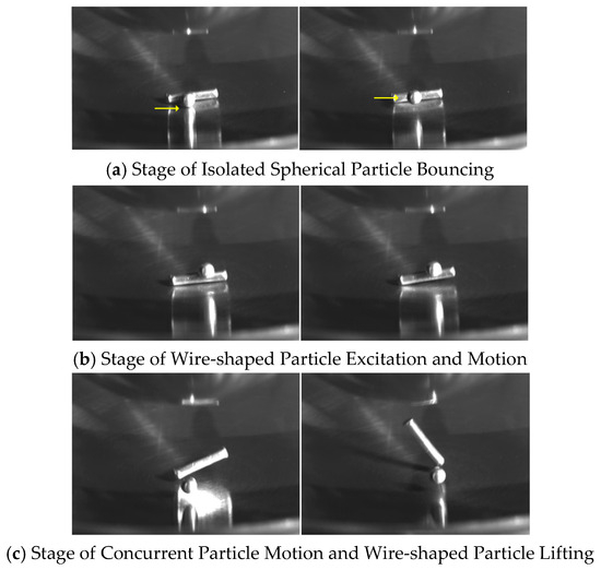 The reason for these discharge characteristics lies in the more complex motion behavior of the Mixed Metal Particles. By synchronously observing the PD signals and particle motion, a clear correlation between the motion process and discharge features can be established. After the combined voltage is applied, the spherical particle jumps first while the wire-shaped particle remains stationary, as shown in Figure 12a. The yellow arrow shows spherical metal particles leaping from the stationary ground electrode into the air. Subsequently, as the spherical particle fully lifts off and collides with the wire-shaped particle (Figure 12b), the wire-shaped particle is excited into the “seesaw-like” motion stage; however, the overall discharge amplitude remains relatively small at this point. This process corresponds to the initial low-amplitude discharge stage. Further, with continued inter-particle collisions and the gradual lifting and eventual vertical jumping of the wire-shaped particle (Figure 12c), the discharge amplitude increases significantly, superimposed with smaller discharge signals generated by the spherical particle. Therefore, the discharge evolution of the hybrid particles exhibits a characteristic of “spherical particles lead the initiation, wire-shaped particles dominate the discharge”.
