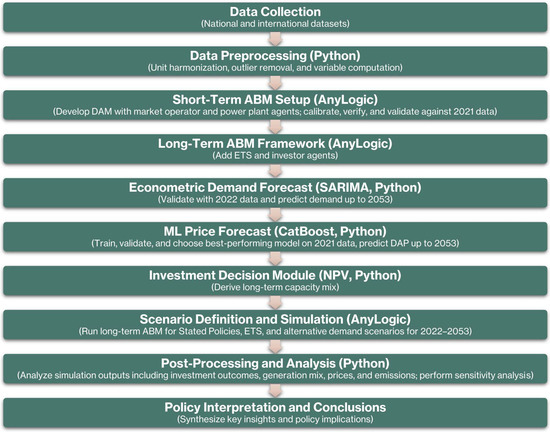 The overall research procedure followed in this study is summarized in Figure 3, which presents the integrated workflow combining econometric, ML, and ABM components. The process begins with data collection from national and international sources, followed by preprocessing and variable computation in Python. A short-term ABM is first developed and validated in AnyLogic to ensure model accuracy before extending it into a long-term ABM that incorporates nuclear generation, an ETS module, and investor decision-making based on NPV analysis. Electricity demand is forecasted using an econometric SARIMA model, while multiple ML models are trained to predict DAP, with CatBoost achieving the best performance. Scenario-based simulations are then conducted for the period 2022–2053 under varying policy and demand assumptions. Finally, post-processing and sensitivity analyses are performed in Python to evaluate prices, generation mix, emissions, and investment outcomes, leading to policy interpretation and conclusions.