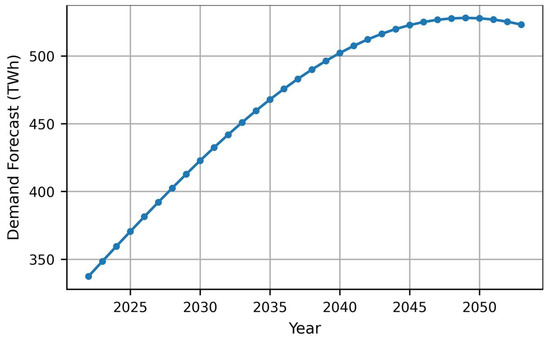 Given the monthly frequency and sample size, this proximity to normality was sufficient. The ADF statistic (–4.36) and PP statistic (–53.30), both with -value~0 confirmed suitability for modeling. The 2022 forecast yielded a monthly mean absolute percentage error (MAPE) of 3.5% and the annual total differed by 1.9% compared to historical (actual) demand data from 2022. After validation, the model was run monthly for the 2022–2053 period (Figure 4). Hourly demand was then obtained by allocating monthly forecasts using the observed 2021 hourly shape.