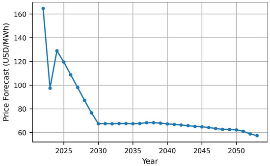 Using long-term capacity mix and fuel prices, the investor projects hourly DAP with the CatBoost model for 2022–2053, which serves as a reference for investment decisions (Table 4). Figure 5 illustrates the yearly average of the predicted prices. All monetary values are expressed in constant 2022 United States dollars (USD_2022) to eliminate the effect of inflation. For brevity, USD_2022 is hereafter denoted simply as USD throughout the paper.