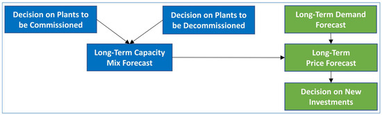 Investor decisions follow the process shown in Figure 6. First, announced licensed projects are commissioned according to their construction periods in Table 6, and plants reaching the end of their lifetimes are retired [53]. For each energy source, future capacity mixes are projected by deriving the average annual new installed capacity during 2020–2023 and adding it to the end-of-2023 installed capacity (Table 7).