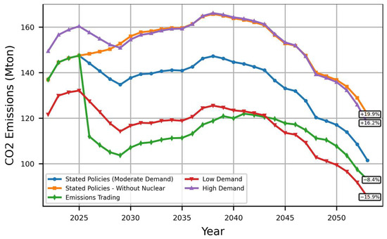 Emissions costs enter the long-term ABM solely through the marginal cost () calculation, as defined in Equation (11). The emission factors (s) are fixed by fuel type (natural gas, imported coal, and lignite), and no endogenous abatement within power plants is modeled. Consequently, emissions reductions in the ETS scenario result from re-dispatch away from carbon-intensive units, rather than from within-plant efficiency improvements. To evaluate the robustness of these assumptions, a sensitivity analysis on emission factors is introduced in Section 4.1 (Stated Policies Scenario), where lower emission factor cases are tested to represent potential efficiency or technology upgrades.