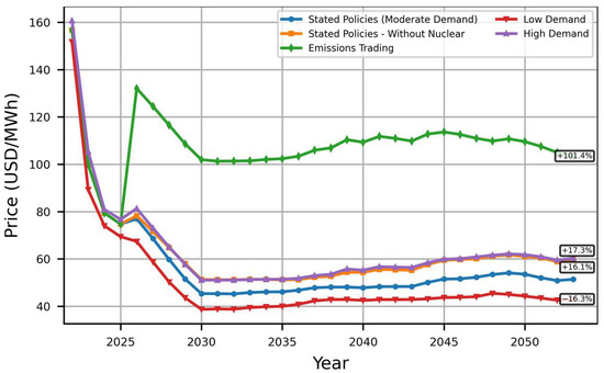 A draft regulation for the establishment of a Turkish ETS was published on 13 November 2023, but has not come into force. Its provisions are closely aligned with those of the EU ETS, particularly regarding the allocation of emission allowances through both free allocation and auctions [30]. The draft envisions a primary market, where allowances are auctioned annually, and a secondary market, where continuous trading occurs through spot transactions or bilateral contracts. Since allocation amounts, demand levels, and reference prices remain undefined, allowance prices in this study are assumed to follow EU ETS prices. The start of the Turkish ETS is assumed to coincide with the launch of the EU’s Carbon Border Adjustment Mechanism (CBAM) in 2026.