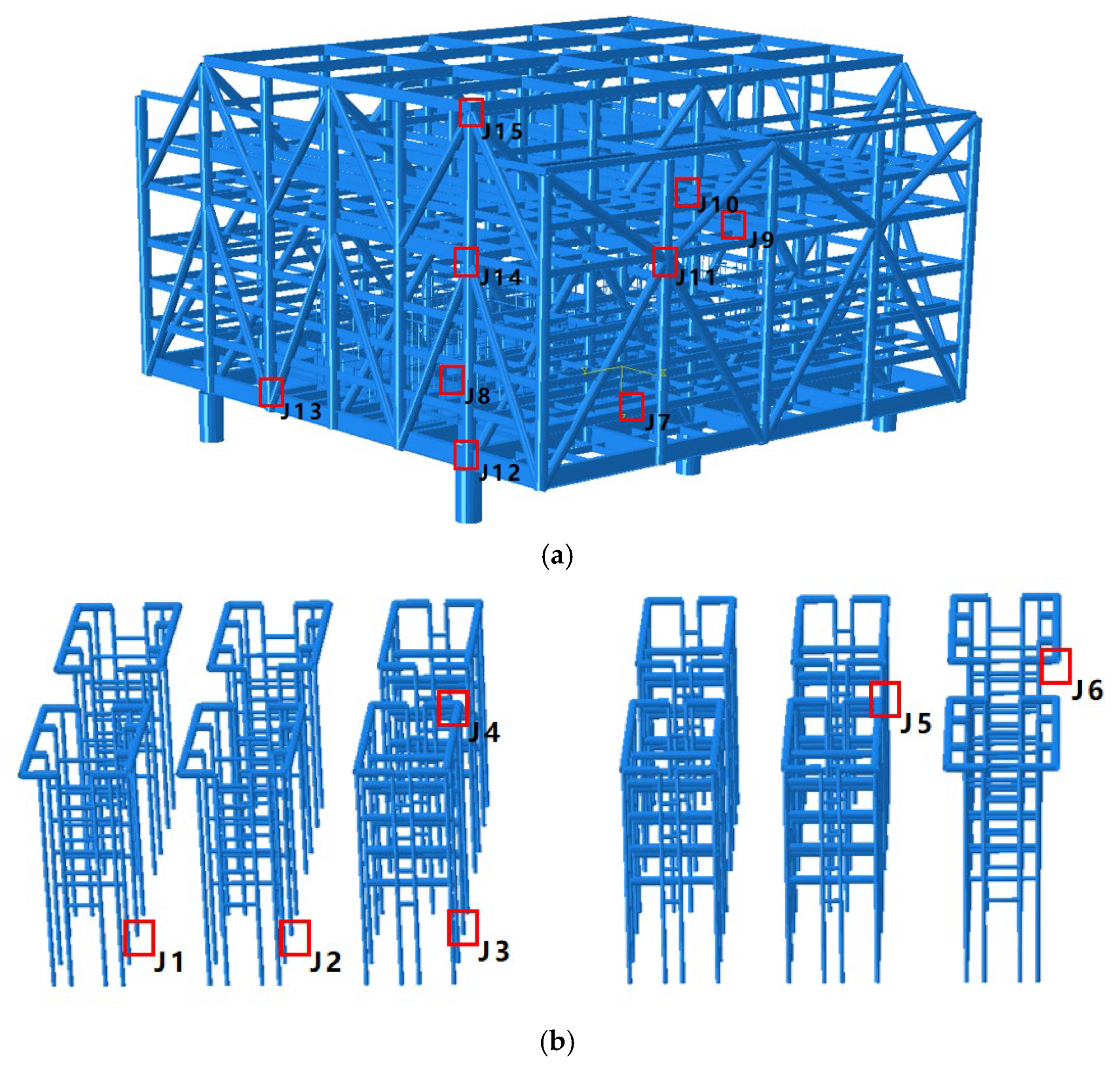 - The platform module has a cantilever structure extending outward along the Y-direction. This structural characteristic has a significant influence on acceleration, while its effect on stress and strain is limited. The acceleration of the deck foundation beam at the edge position is about 47% higher than that of the mid-span foundation beam. Due to the arrangement of converter valve equipment on the first-layer deck foundation beam, its acceleration vibration frequency is 15% faster than that of other floors. Under comparable weight conditions, stress and strain exhibit an increasing trend with the rise in height. The Z-direction acceleration of the main column structure of the platform module is the largest, while for other column structures, the X-direction and Z-direction accelerations are close.