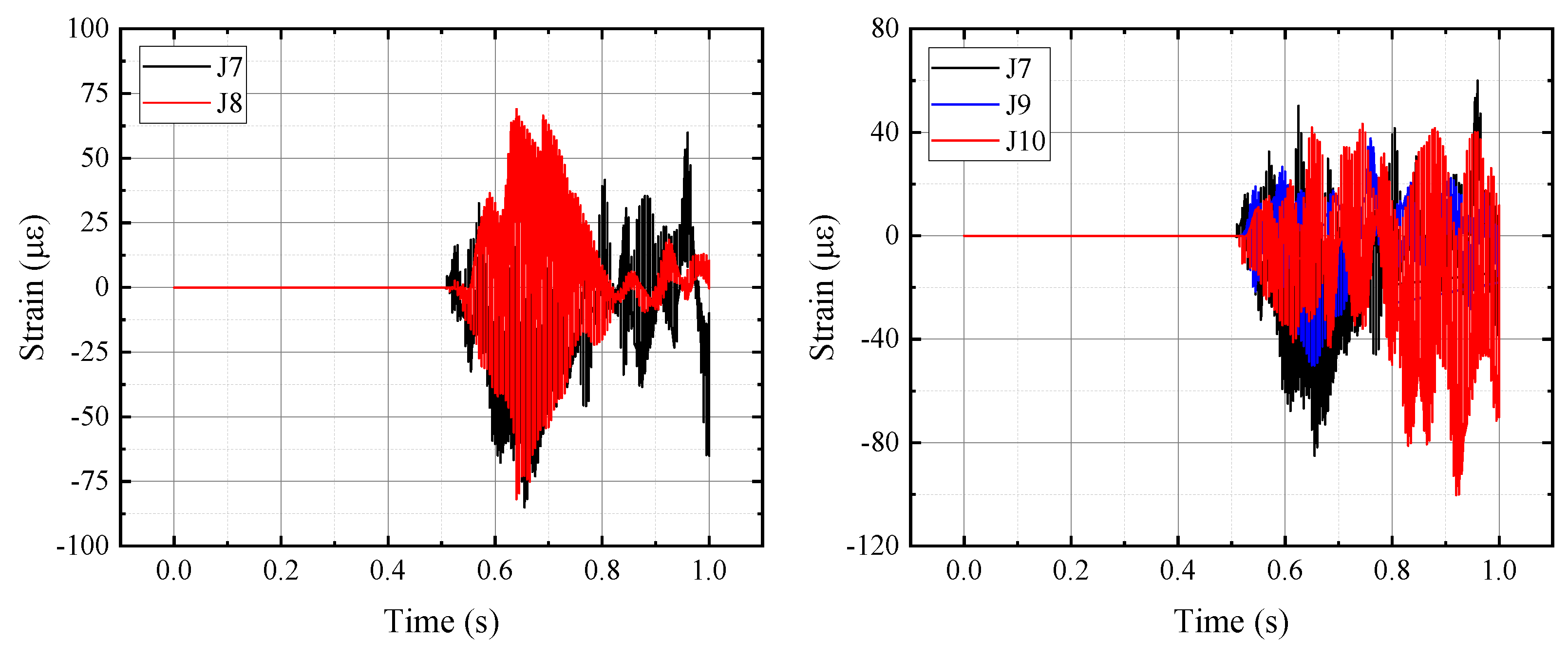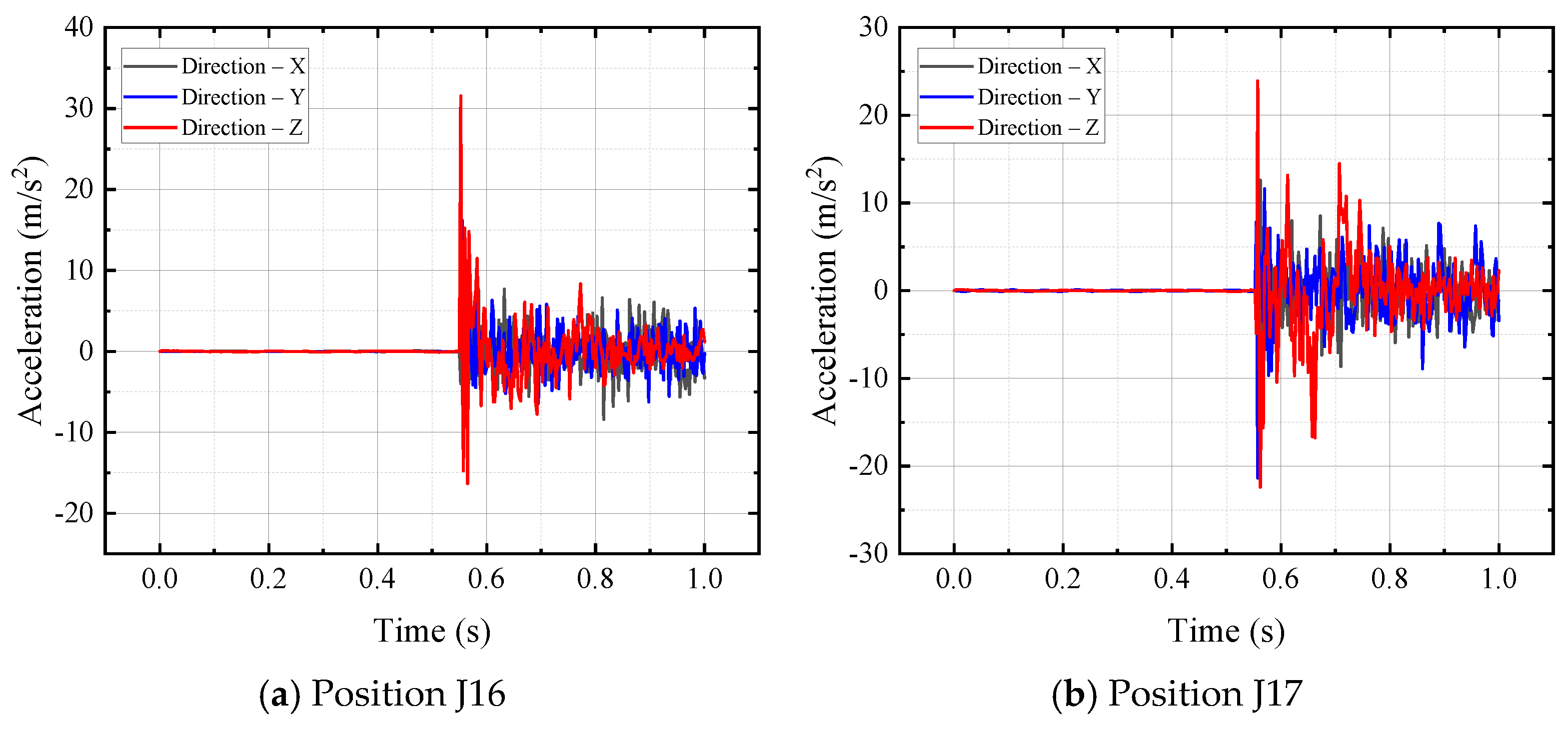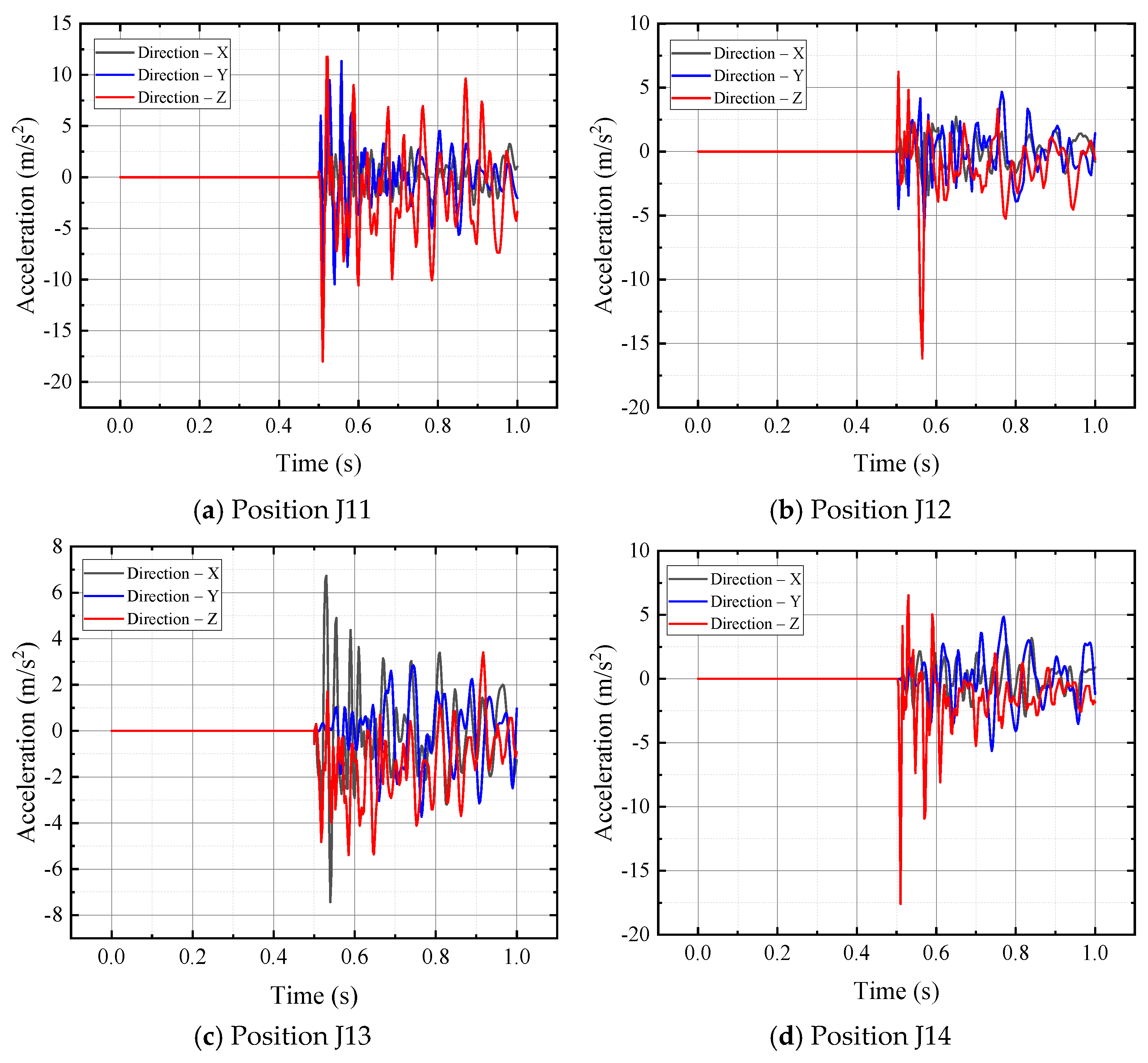 - The pile legs of the jacket structure exhibit pronounced stepwise variations in dynamic response when subjected to transient impact loads induced by contact collisions. The dynamic response of the pile legs at the mid-span position is about 25% greater than that at the edge positions, forming a non-uniform response characteristic of “strong at the mid-span and weak at the edges”. Meanwhile, as it is necessary to reserve space for barge entry to carry out float-over installation, the top of the jacket structure is formed by a Y-Z plane composed of columns and braces. This configuration results in relatively large X-direction and Y-direction accelerations of the main pile legs, reaching about half of the peak of Z-direction acceleration.