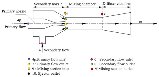 The secondary fluid expands in the secondary chamber due to the pressure reduction. The velocity (), enthalpy (), and density () of the outlet of the secondary nozzle and the outlet cross-sectional area () of the primary nozzle are calculated according to the inlet state 6 and the outlet pressure () ( = ) of the secondary fluid. The mathematical model is as follows: