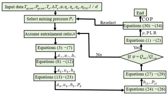 From the P-h diagram of the CTHP system, the discharge pressure is equal to the Pgc,out in the previously assumed conditions of this paper. Under the known conditions—Tgc,out, Te, and ΔTe of the low-temperature evaporator, the matching ratio of the composite heat source, isentropic efficiency of the primary nozzle, secondary nozzle, the diffuser chamber of the two-phase ejector, and a mixing chamber length-to-diameter ratio of 10—the mixing pressure of the ejector was selected in order to obtain the maximum system performance coefficient, then the ejector entrainment coefficient was assumed. In conditions of optimum mixing pressure and the total cooling capacity of the water and high-temperature evaporator remaining unchanged, the optimum COP of the system performance and the corresponding gas cooler outlet pressure (Pgc,out), the ejector entrainment coefficient, and other parameters are calculated in MATLAB R2019b. The mathematical model solution process is shown in Figure 4.