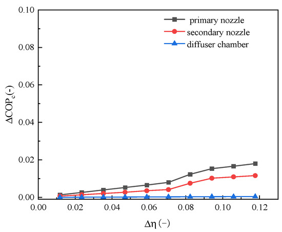 In the simulation of the CTHP system, the isentropic efficiencies of the primary nozzle, secondary nozzle, and diffuser chamber are assumed to be a constant value of 0.85. However, in reality, this efficiency is subject to variation due to changes in operating conditions and geometric tolerances. To quantify the impact of this uncertainty on system performance, the sensitivity analysis of the ejector efficiency is shown in Figure 5.
