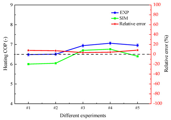 To verify the accuracy of the model, some simulation results were first obtained under the above input conditions, and Figure 7 shows the comparison results between experimental values and simulated values. Through the comparison, it was found that the maximum relative error of the heating COP was within 8.49%, indicating that the established model can effectively predict the system performance.