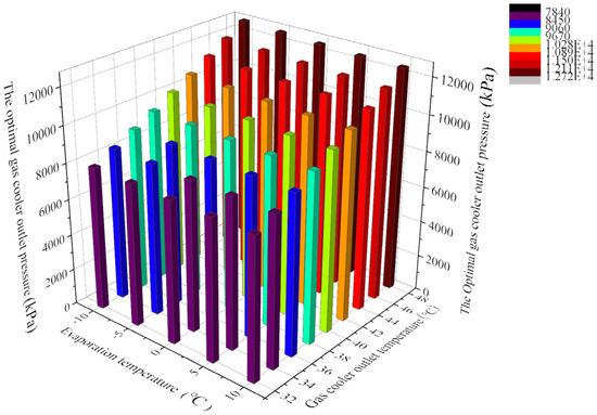 The control and optimization of gas cooler outlet pressure is crucial to improve the performance of the CTHP system. The gas cooler outlet pressure (Pgc,out) corresponding to the peak COP is called the Popt,out,gc. The variations in the Popt,out,gc are shown in Figure 8, where Te is −10–10 °C, Tgc,out is 30–50 °C, and the composite-heat-source matching ratio is 1.5. In the range of working conditions, the Popt,out,gc rises significantly, and the maximum increase is 59.21% with the rise in Tgc,out. Popt,out,gc decreased slowly and the maximum decrease is 2.72% with the increase in Te. It can be seen that the effect of Te is much smaller than that of Te; in addition, it can be seen that the effect of Te is much smaller than that of Tgc,out, which was also obtained in the study of Bahman [37]. When Tgc,out is higher than 40 °C, Popt,out,gc is above 10,000 kPa.