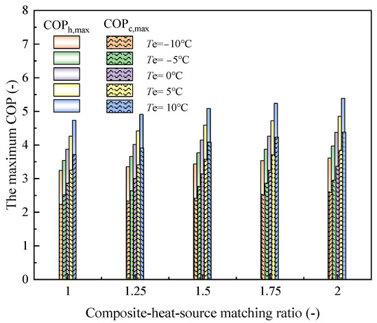 Variations in COPc,max and COPh,max under the operating conditions of composite-heat-source matching ratio φ (1–2), evaporation temperature Te (−10 °C to 10 °C), and gas cooler outlet temperature Tgc,out (40 °C) at Popt,out,gc are shown in Figure 11. It can be seen that the COPc,max and COPh,max of the CTHP system increase as the Te and φ increase. It can be seen that the COPc,max and COPh,max of the system vary from 2.226 to 4.383 and 3.225 to 5.53, respectively. As Te increases, the maximum improvement ratios of COPh,max and COPc,max are 49.80% and 69.26%, respectively, and are 14.01% and 18.26% with the increase in the composite-heat-source matching ratio. Furthermore, it should be noted that when Te rises from −10 °C to 10 °C and φ varies from 1 to 2, the heating performance improvement ratio of the CTHP system over that of the cooling performance increases from 66.68% to 96.90%. This implies that it is better to seek optimum system performance by changing the combination of main operation parameters, and the effects of the composite-heat-source matching ratio on CTHP system performance cannot be ignored.