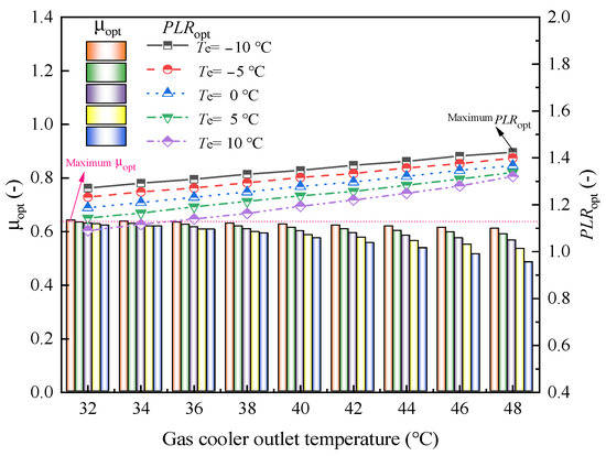 To be conclusive from Figure 12, the maximum improvement ratio of μopt is 4.99% with the increase in Tgc,out when Te is −10 °C, and the maximum improvement ratio of μopt is only 2.88% with the increase in Te when Tgc,out is 32 °C, which indicates that the μopt yields a tiny variation amplitude by adjusting Te or Tgc,out when Tgc,out or Te is lower. This minor change indicates a low sensitivity and also demonstrates the robustness of the ejector within the range of the working conditions. The maximum improvement ratio of μopt is 32.14% with decreasing Tgc,out and Te, and the maximum improvement ratio of PLRopt is 30.69% with the increase in Tgc,out and the decrease in Te.