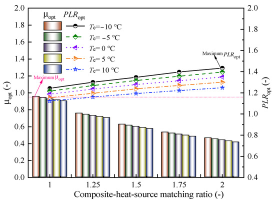 The variations in the compressor pressure ratio at the optimum performance coefficient for different evaporator temperatures and composite-heat-source matching ratios are depicted in Figure 15. The γopt decreases with the decrease in Te and increase in φ. In the range of working conditions, the maximum reduction in the compressor pressure ratio under the optimum COP is 36.91% with the increase in Te, and the maximum reduction is 14.80% with the rise in the composite-heat-source matching ratio. The maximum improvement ratio of γopt is 43.78% by increasing Te and φ. So, finding the compressor pressure ratio corresponding to the optimum COP under different working conditions can provide a reference for the adjustment of system operating parameters.