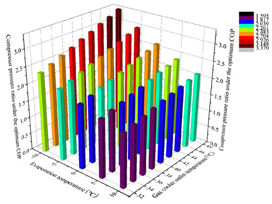 The compressor pressure ratio (γ) is an important index to evaluate compressor efficiency. The variation in the compressor pressure ratio under the optimum COP (γopt) with the different Tgc,out and Te is shown in Figure 14. It can be seen that the γopt tends to reduce as the Tgc,out decreases. The γopt decrement is mainly attributed to the decrements in the Pgc,out and the compressor suction pressure with the decrease in Tgc,out. It also appears that the γopt decreases with rising Te; this is because the outlet pressure and a specific enthalpy of evaporator increase with increasing Te, leading to an increase in the suction pressure in the compressor, and a decrease in the compressor compression ratio. The maximum improvement ratio of γopt is 52.55% by increasing Te and decreasing Tgc,out.