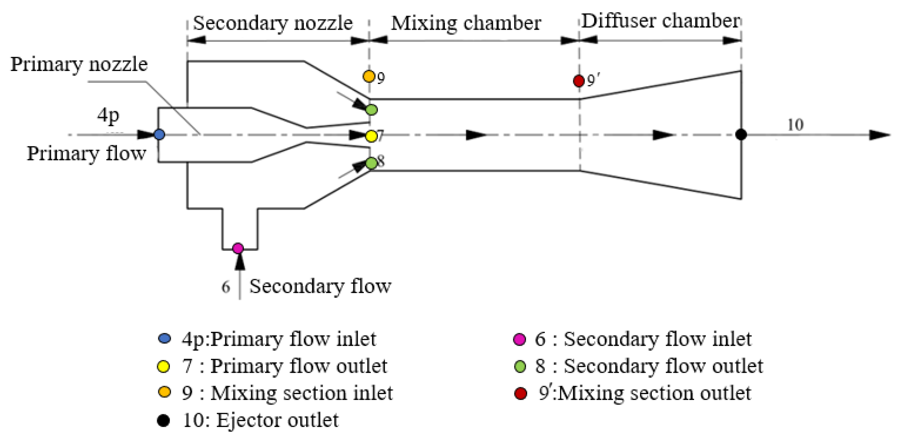 - The parameters of state 7 can be calculated by Equations (3)–(7), and the parameters of state 8 can be obtained by Equations (8)–(12). Then, the mixing chamber outlet state 9 can be calculated from Equations (13)–(23). According to Equations (24)–(26), state 10 of the diffuser outlet state can be obtained.