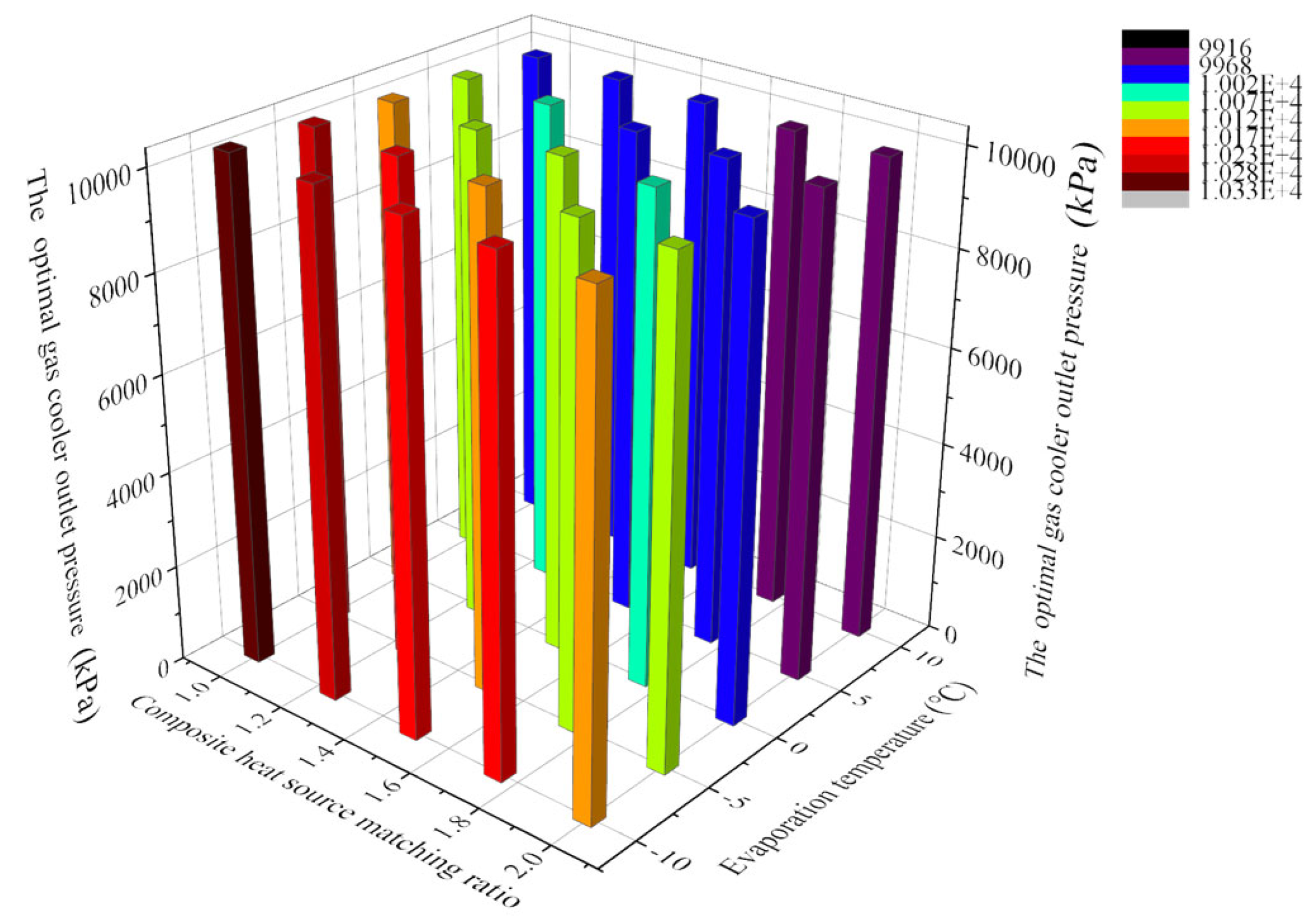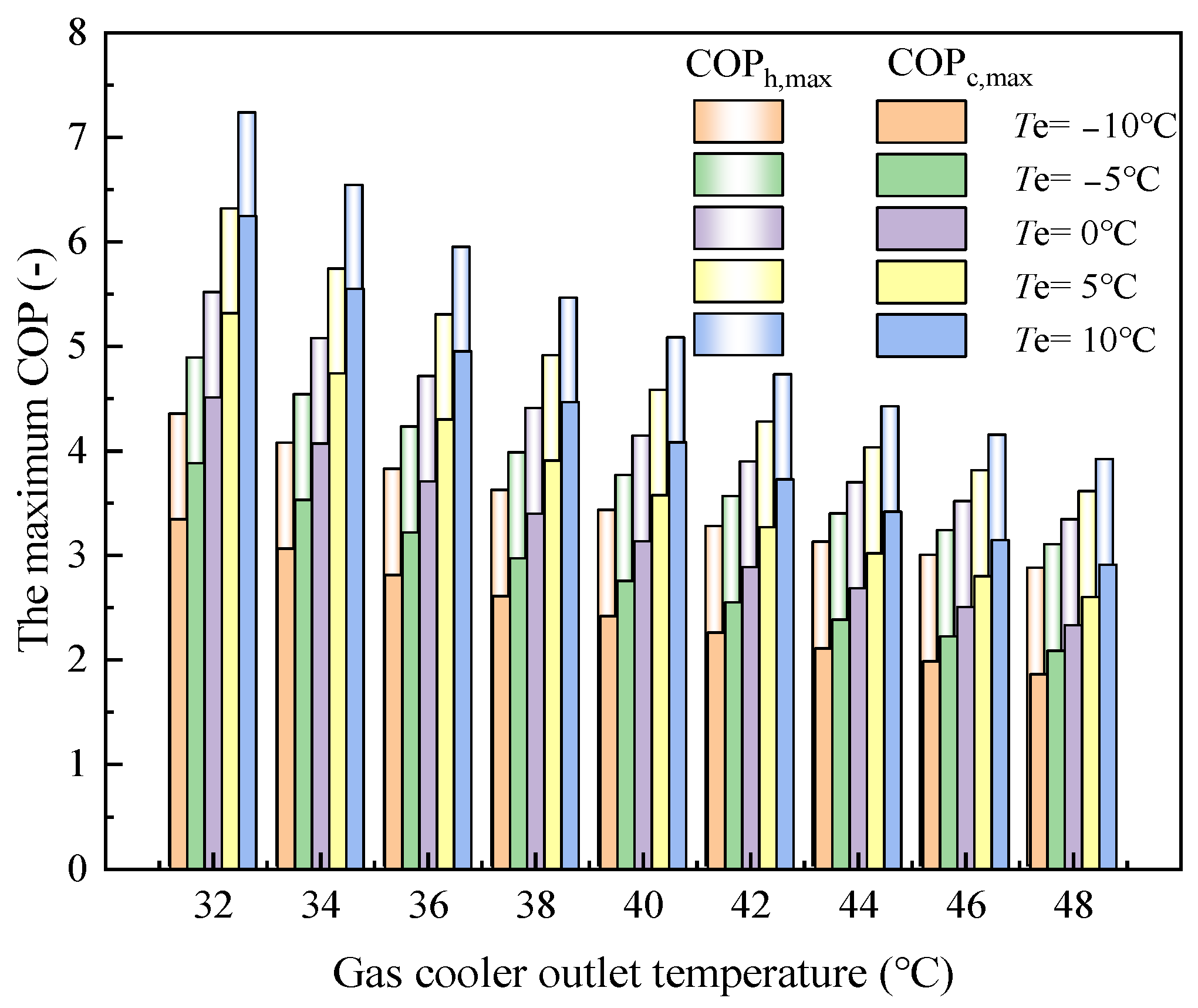 - The maximum COP of the system was obtained by changing the outlet pressure of the gas cooler, and the step size was 1 kPa. For CTHP systems, the system COP can be expressed as .