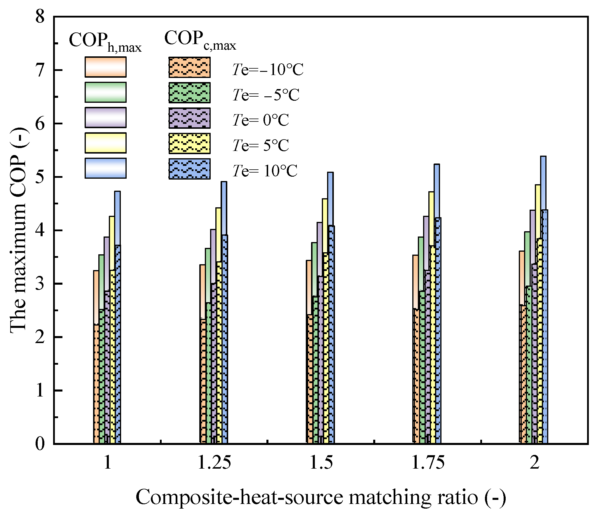 - The optimum system performance coefficient and corresponding Popt,out,gc are found using the same optimization. To achieve the optimum system performance, the results under the optimum mixing pressure corresponding to different Te are adopted. In this numerical model, the convergence errors of density and matching ratio of the composite heat source are both 10−3.