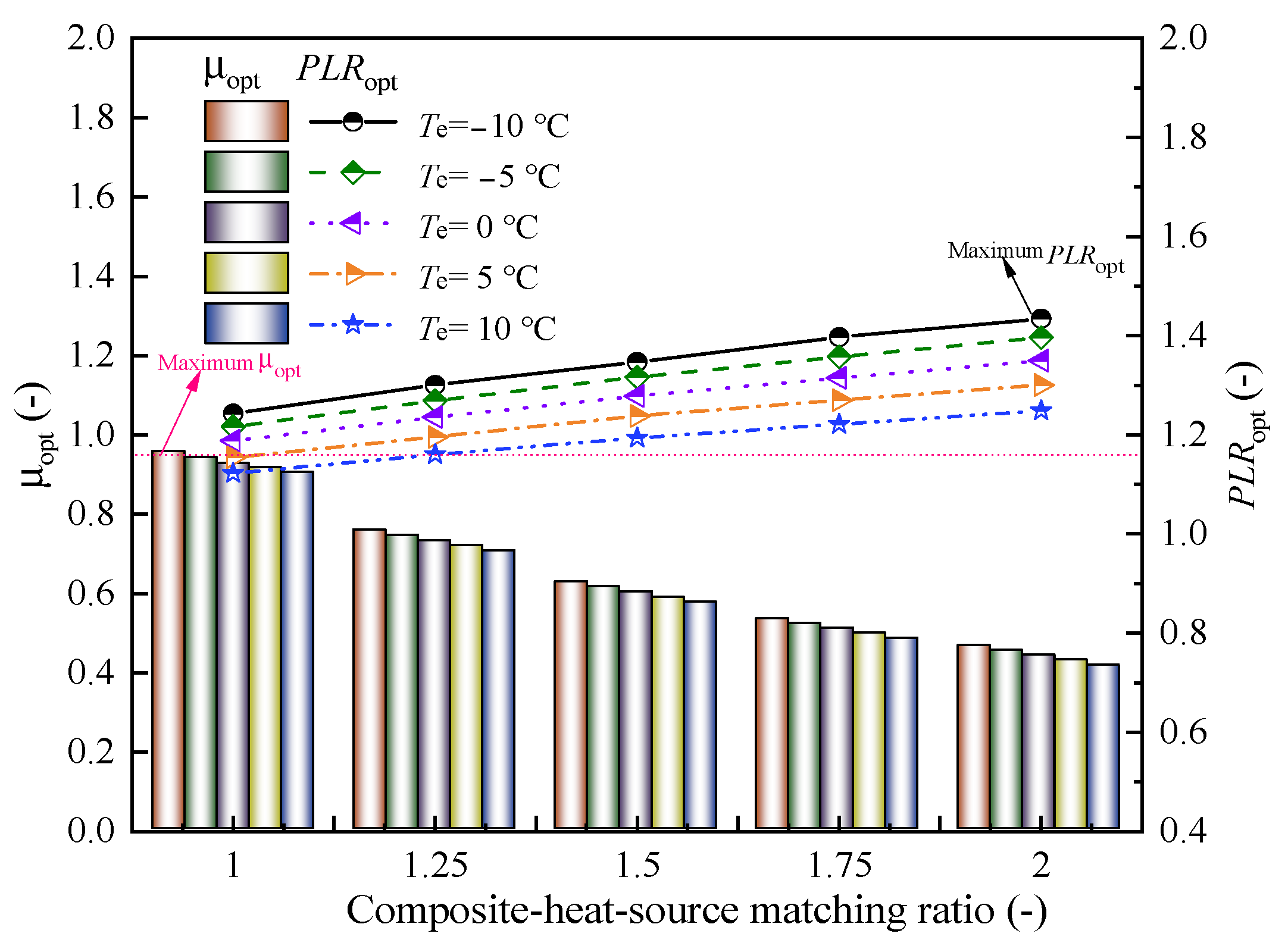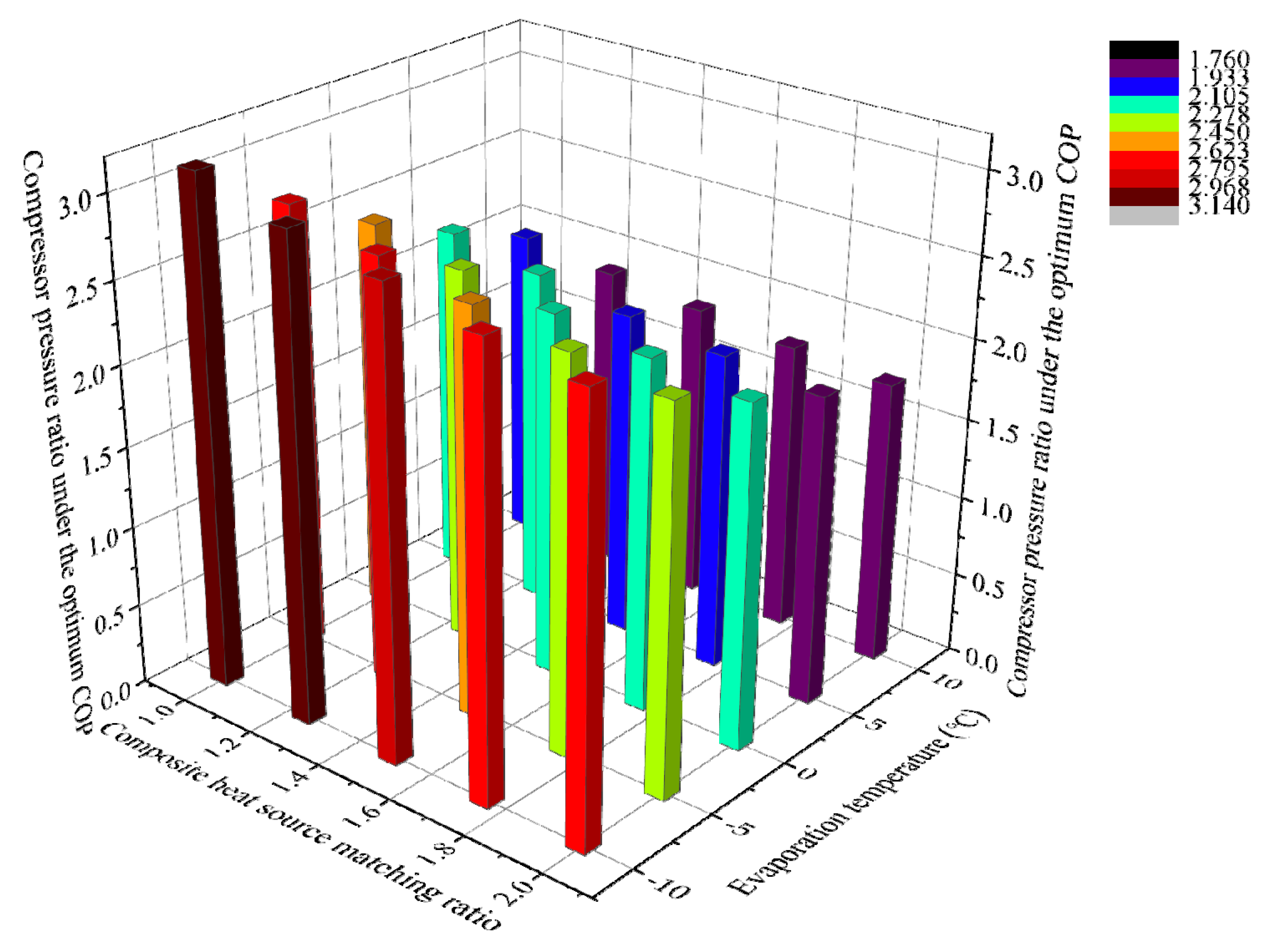 - When designing or operating the CTHP system, a higher evaporator temperature, lower Tgc,out, and higher composite-heat-source matching ratio were found to be more successful in achieving both a lower optimum high-pressure side and maximum system COP. The maximum improvement ratio of the μopt is 32.14% with decreasing Tgc,out and Te, and that of the PLRopt is 30.69% with the increase in Tgc,out and the decrease in Te. The μopt decreases and PLRopt increases as the composite-heat-source matching ratio increases, and the maximum improvement ratios of μopt and PLRopt are 54.09% and 15.40%, respectively. The optimum high-pressure side governing equation of the CTHP system and the expressions for optimum cycle parameters of the CTHP system were obtained by multivariate nonlinear regression analysis.
