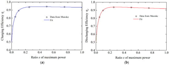 where is the charging or discharging efficiency, x is the ratio of maximum power, and a, b, c, d, and e are fit parameters. Because the data from Munzke does not comprise the x-range from 0 to about 5%, this part was extrapolated, constraining the value at x = 0 to = 0.5. The values of the corresponding fit parameters were determined in the work presented here using the data analysis software Origin (version 9.0.0) and are given in Table 2. The efficiency curves are depicted in Figure 1.