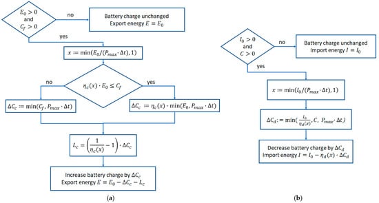 The assumed strategy for charging and discharging was to maximize self-consumption of the PV system. (The strategy is chosen for simplicity. More complicated strategies for increasing the economic benefit involving forecasts of consumption, etc., are discussed at the end of this paper and could be part of future research). The algorithm for charging and discharging simulation is sketched in Figure 2. The calculation is done for every time interval Δt (1 h). During a single interval, both charging and discharging can occur. Here, the calculation shown in Figure 2a is performed first, followed by the calculation shown in Figure 2b. The quantities used are defined as follows: