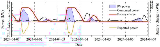 An example of the work of this algorithm for a virtual battery with 10 kWh capacity and 10 kW maximum power is presented in Figure 3. The algorithm was applied to the measured data and shows the first week of April 2024. On sunny days, the battery is quickly charged during a few morning hours and discharged during the nights.