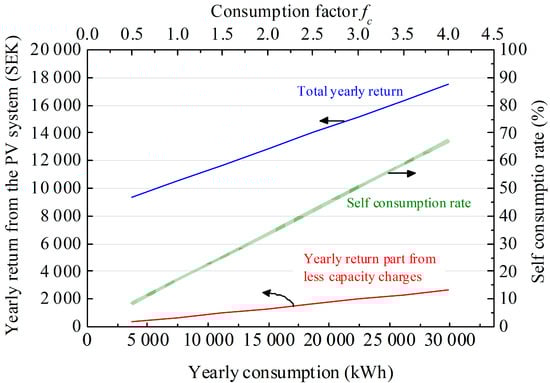 Without a PV system, the yearly consumption-dependent costs for electricity would have been SEK 15,669 when using the constant tariff B, where about 25% of it corresponds to the capacity charge. “consumption-dependent costs” denote costs excluding fixed monthly costs for having a contract with the electricity retailer and the distribution system operator.
