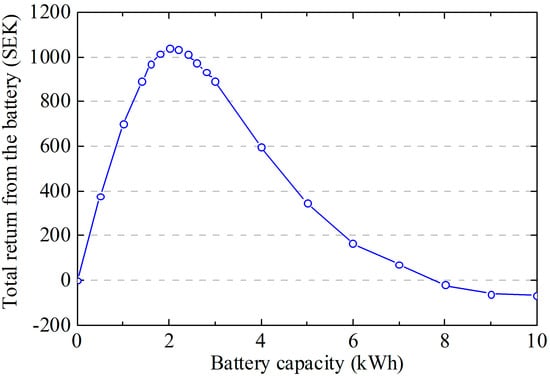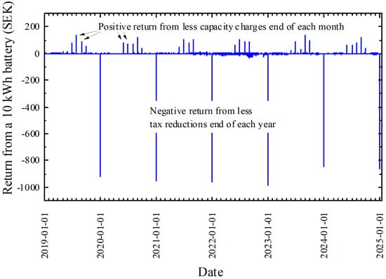 Here, and are the imported and exported electric energies for the virtual case of not having a PV system or BESS, respectively. For every hour, the electricity costs are calculated for the case of not having a PV system or a battery, and then the costs for the case of having the PV system but no battery are subtracted. This return for every hour is accumulated over the six years. The investment costs of SEK 112,000 for the PV system are not yet included in this calculation.