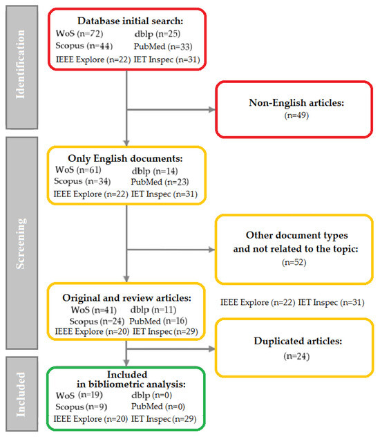 This review utilizes tools built into the WoS, Scopus, PubMed, dblp, IEEE Explore, and IET Inspec databases for bibliometric analysis, which will facilitate replication and supplementation of the study in the future. The proposed review methodology allows for precise categorization of results by keywords, authors, affiliations, research areas, documents, and sources. The results of the analysis are presented in both text and visual form to ensure that the review is adapted to the complexity of the topic (Table 3, Figure 2, Figure 3, Figure 4, Figure 5 and Figure 6).