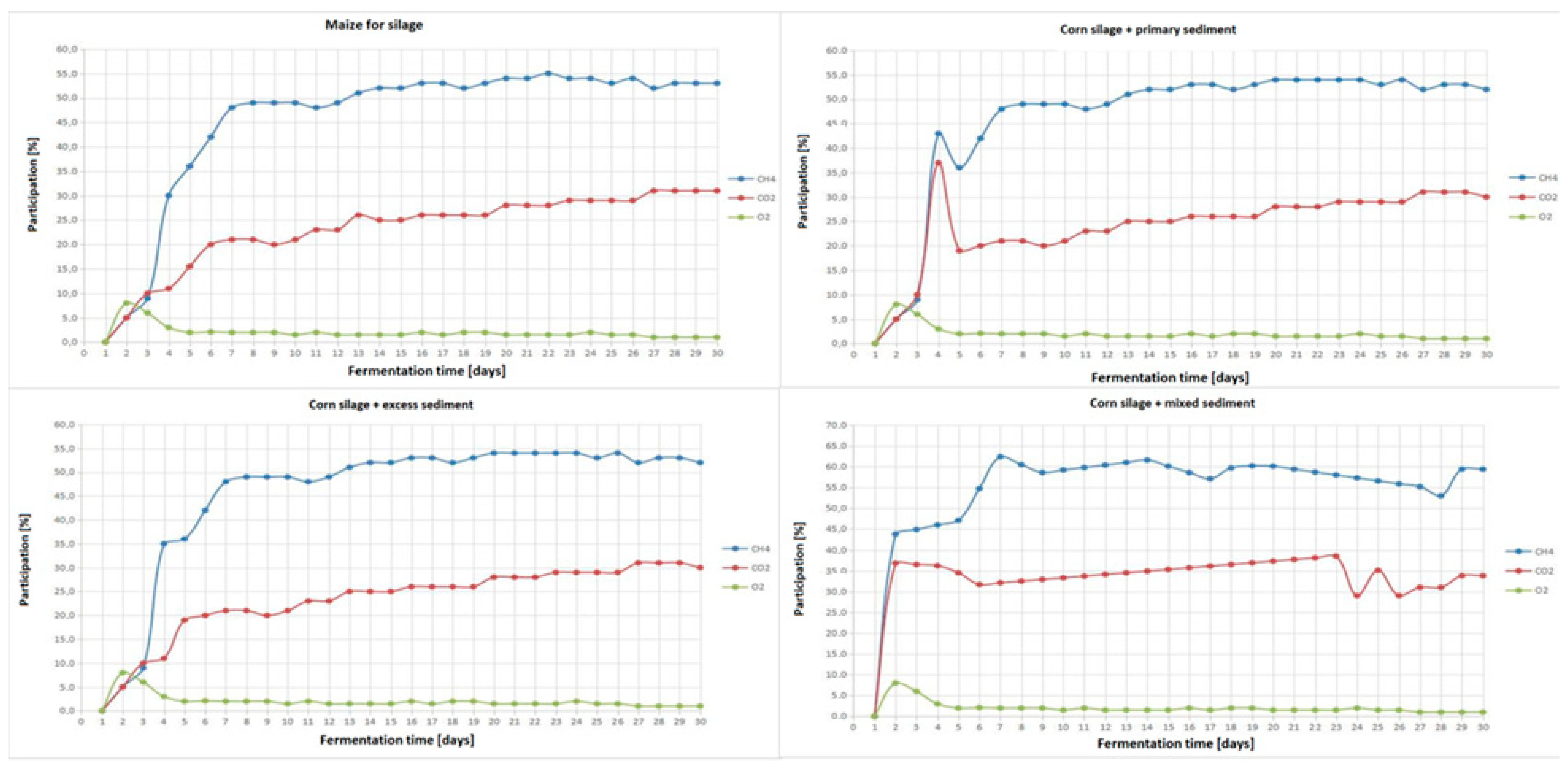 The apple pomace and mixed sludge feedstock was distinguished by the highest methane content, which already exceeded 45% on day 6 and remained in a high range between 50 and 60% from day 8 to 29 of the process. In the case of this feedstock, the carbon dioxide content also stabilized potentially quickly (7th day) and did not exceed 40% by the end of the process.