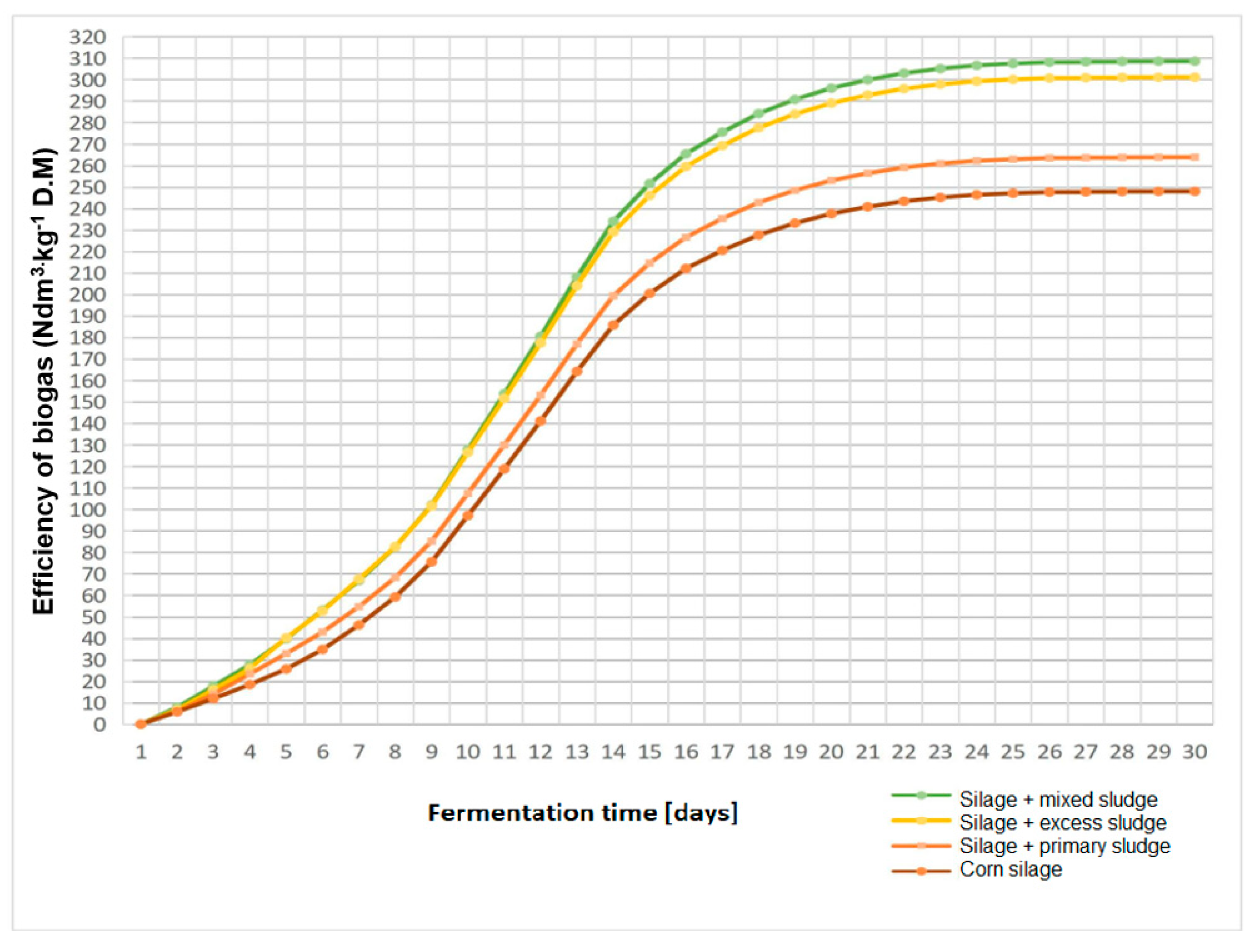 Agricultural biomass was watered with raw sewage sludge. The dry matter content in the mixes was 10%, and fermentation was carried out under mesophilic conditions (approximately 38 °C).