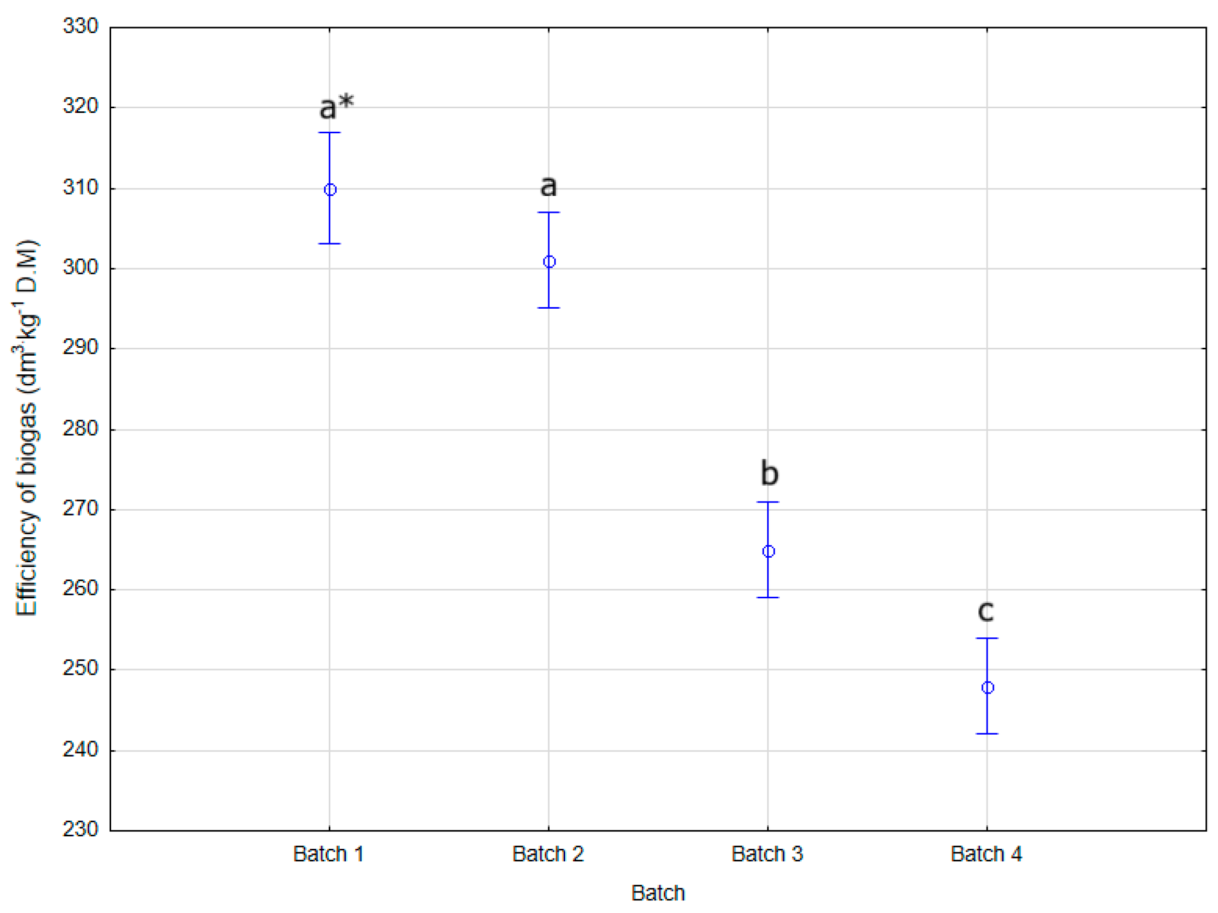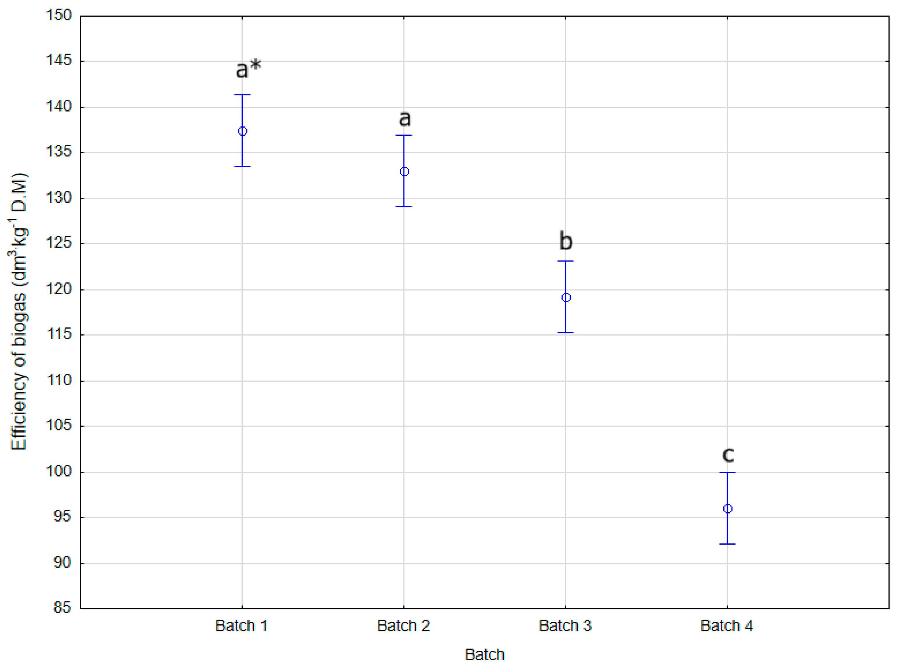The Duncan test showed that homogeneous groups were formed within the fractions with the highest biogas yield, which were the fractions made from apple pomace with both primary and excess sediment. Separate groups with lower biogas yields were formed by the fractions from apple pomace with mixed sediment and the substrate made solely from apple pomace.