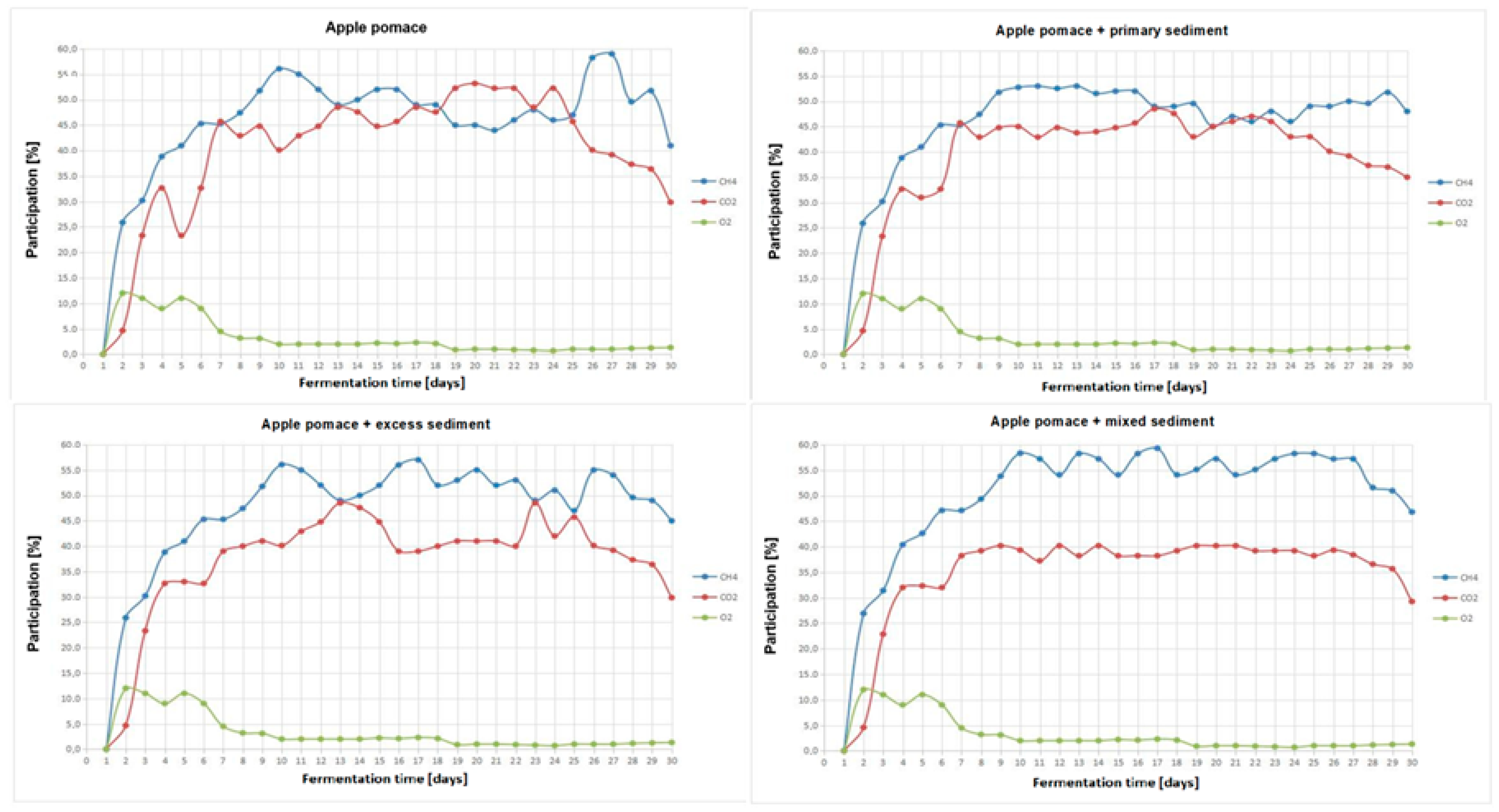 When fermenting only apple pomace, the carbon dioxide content was variable throughout the fermentation, between 19 and 24 days, its level exceeded the methane content and reached almost 55%.