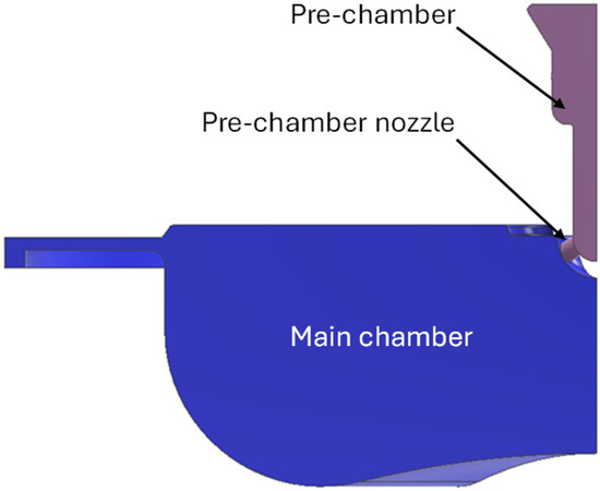 Engine geometry with details of the pre-chamber and main chamber.