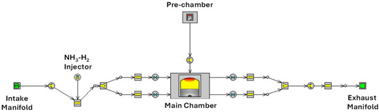 A single-cylinder model (Figure 2) of the investigated engine has been built in the well-known GT-Power environment [37]. The engine layout part between the intake and exhaust manifolds has been reproduced. The pre-chamber is described as a constant volume connected to the main combustion chamber, while the mixture formation is modeled considering the gaseous injection of the NH3/H2 mixture into the cylinder intake duct. Combustion is imposed by means of assumed Wiebe functions.