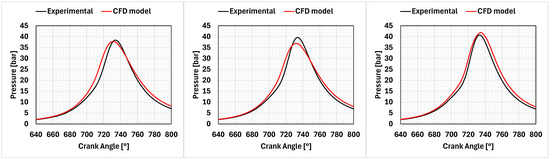 Model validation considering a light-duty engine [30]. The mixtures investigated were neat ammonia (left), 5% of hydrogen by volume (middle), and 15% of hydrogen by volume (right).